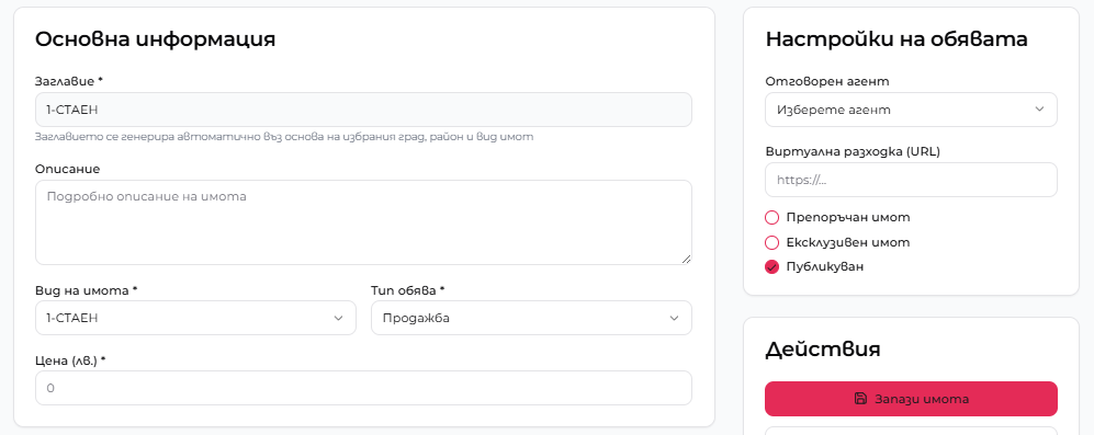 - Запази имота: Запазва и публикува новата обява според зададените настройки.