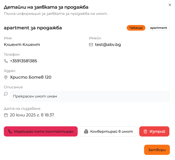 Включва данни като тип имот, статус, име, имейл, телефон, адрес, описание и дата на създаване. -